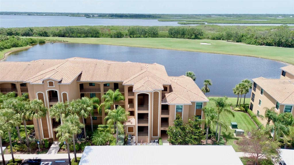 Wonderful opportunity within the gates of River Strand. This popular GOLF DEEDED Colonade end-unit offers outstanding water and golf course views. As the largest of The Terrace floor plans, it features 2 bedrooms, 2 full baths, and a den. This condo comes fully turnkey furnished as a 3-bedroom unit, complete with new leather couches, and extra comfortable beds, updated kitchen appliances, linens, dishware, and more. It's truly move-in ready – just bring your suitcase and head straight to the golf course! For peace of mind, the property features hurricane-resistant windows and patio doors. Impressively solid construction and protected location. The spacious eat-in kitchen serves as the heart of the home, boasting granite countertops with a breakfast bar, solid wood cabinets, stainless steel appliances, a pantry, and a convenient adjoining laundry room. The owner's suite includes an ensuite bath with dual walk-in closets, and the versatile den features pocketing double doors for flexible use. Ownership includes a deeded golf membership to the 27-hole Arthur Hills-designed course and access to the impressive 39,000 sq ft Tuscan-inspired clubhouse, which is currently undergoing design renovations. Amenities include an on-site restaurant and grill room, two state-of-the-art fitness centers with 24/7 access, a TIKI BAR, two resort-style pools with a hot tub and resistance pool, plus eight heated satellite pools, eight PICKLEBALL courts, and a separate tennis club with eight Har-Tru lighted courts. Enjoy an easy resort lifestyle in this active community, with the added benefit of lock-and-leave, maintenance-free living with easy access to beaches, dining and shopping.